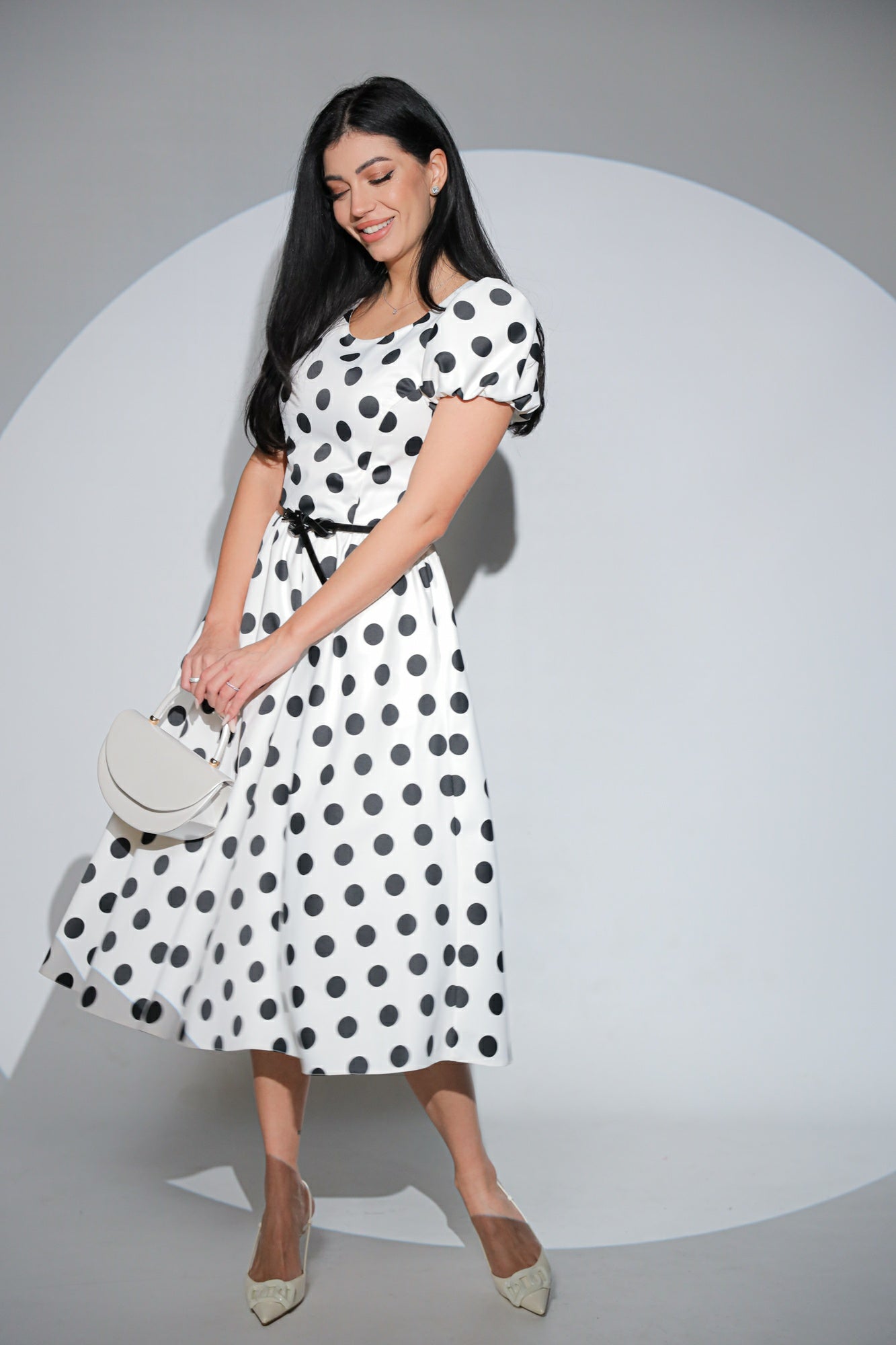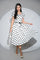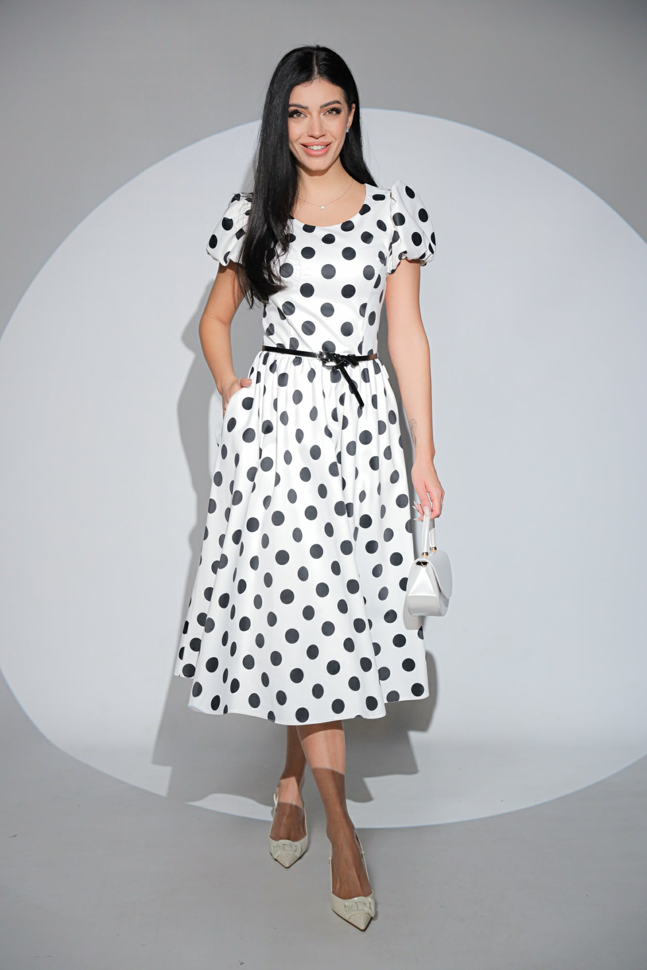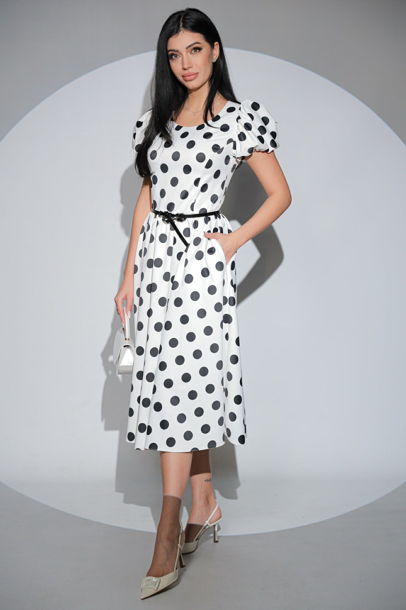 Rochia Dottie Blanc - este o rochie midi cu aer clasic și alb impecabil, presărat cu buline negre mari, dispuse ordonat și modern.