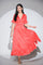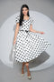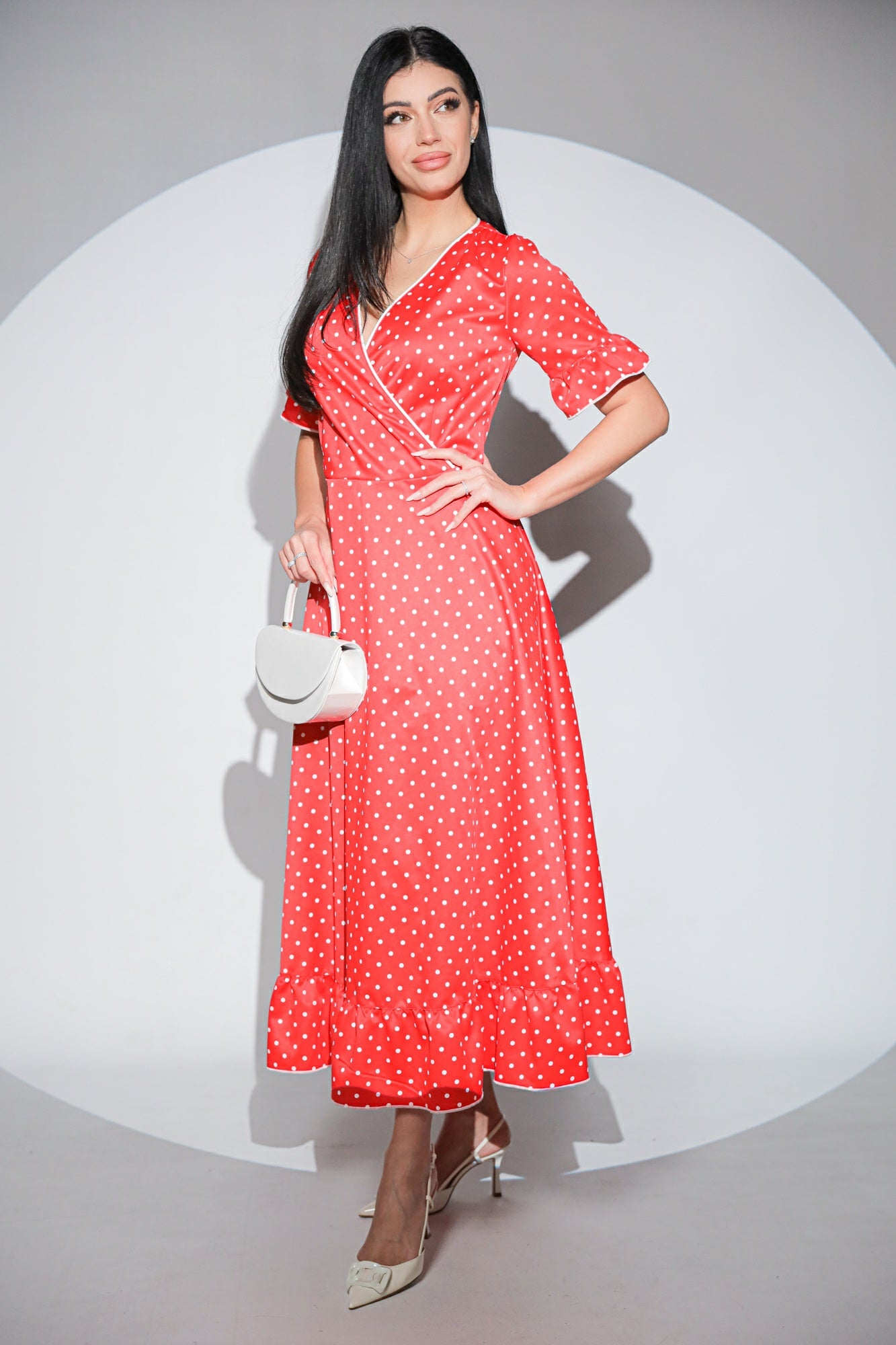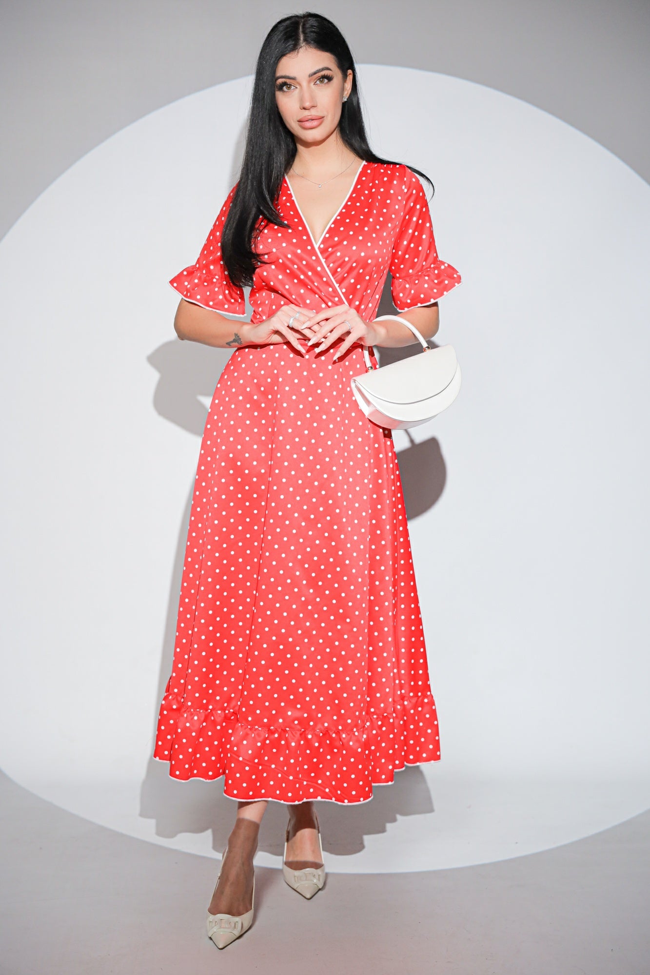 Bulinele albe sunt dispuse uniform pe fondul roșu intens, iar fusta amplă se termină într-un volan fluid care aduce mișcare și lejeritate la pas. Mânecile au același finisaj, creând continuitate și delicatețe în design.