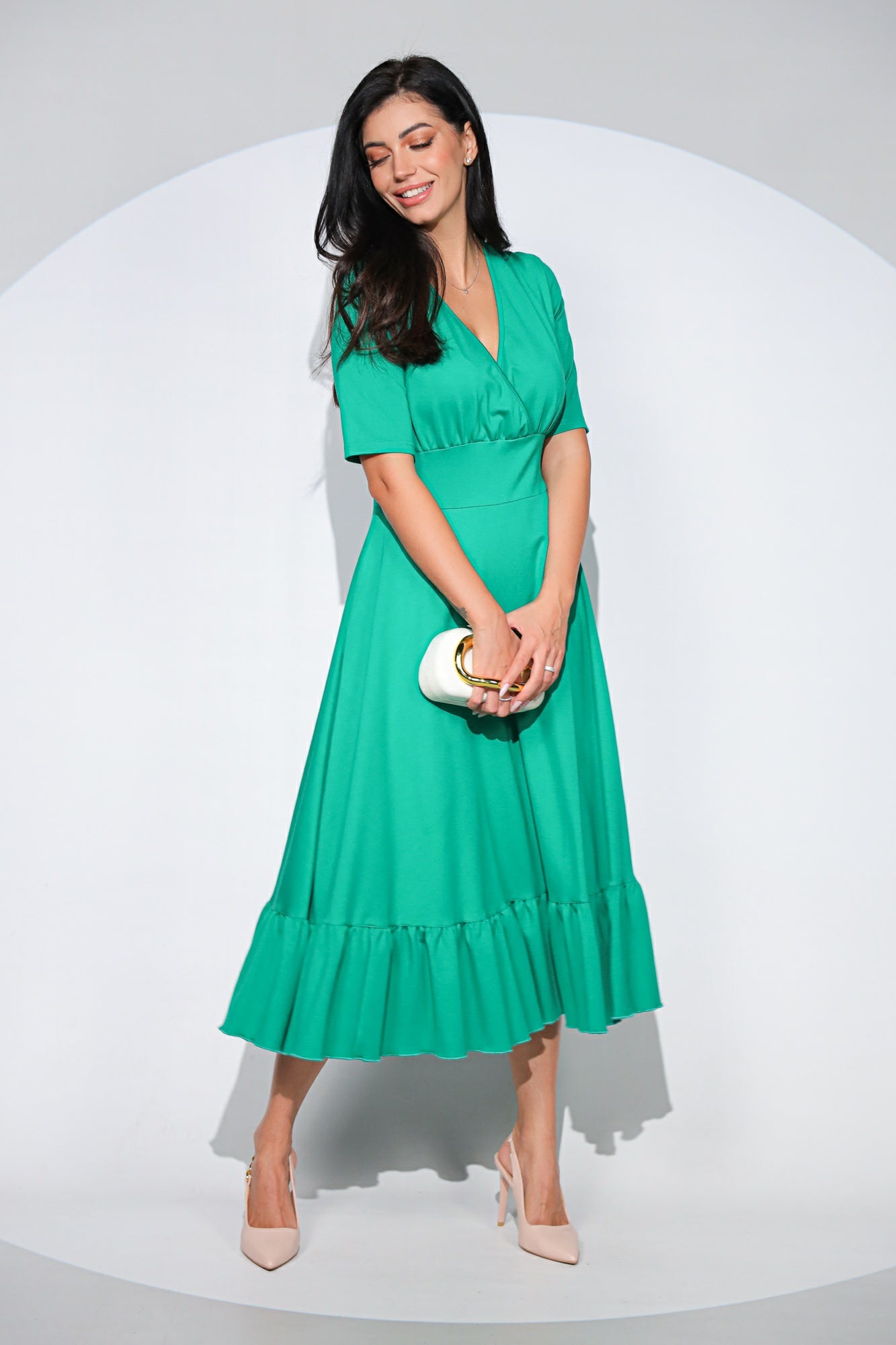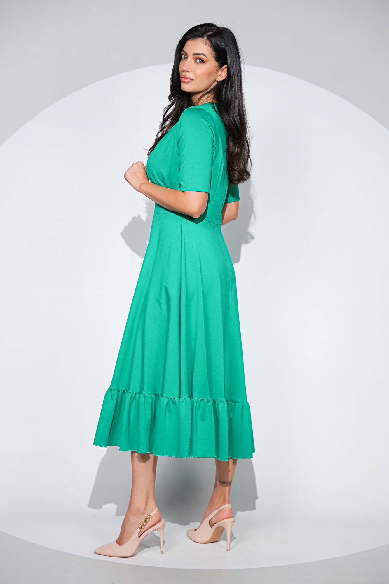 Rochia Althea Verde cucerește prin naturalețea și prospețimea ei. Croiul feminin, cu decolteu petrecut și talie subliniată, se completează cu volanul elegant de la tiv și buzunarele discrete ce îi sporesc versatilitatea. Confecționată din jerseu cu bumbac, este comodă și practică, dar rămâne sofisticată prin simplitate și nuanța intensă de verde crud.