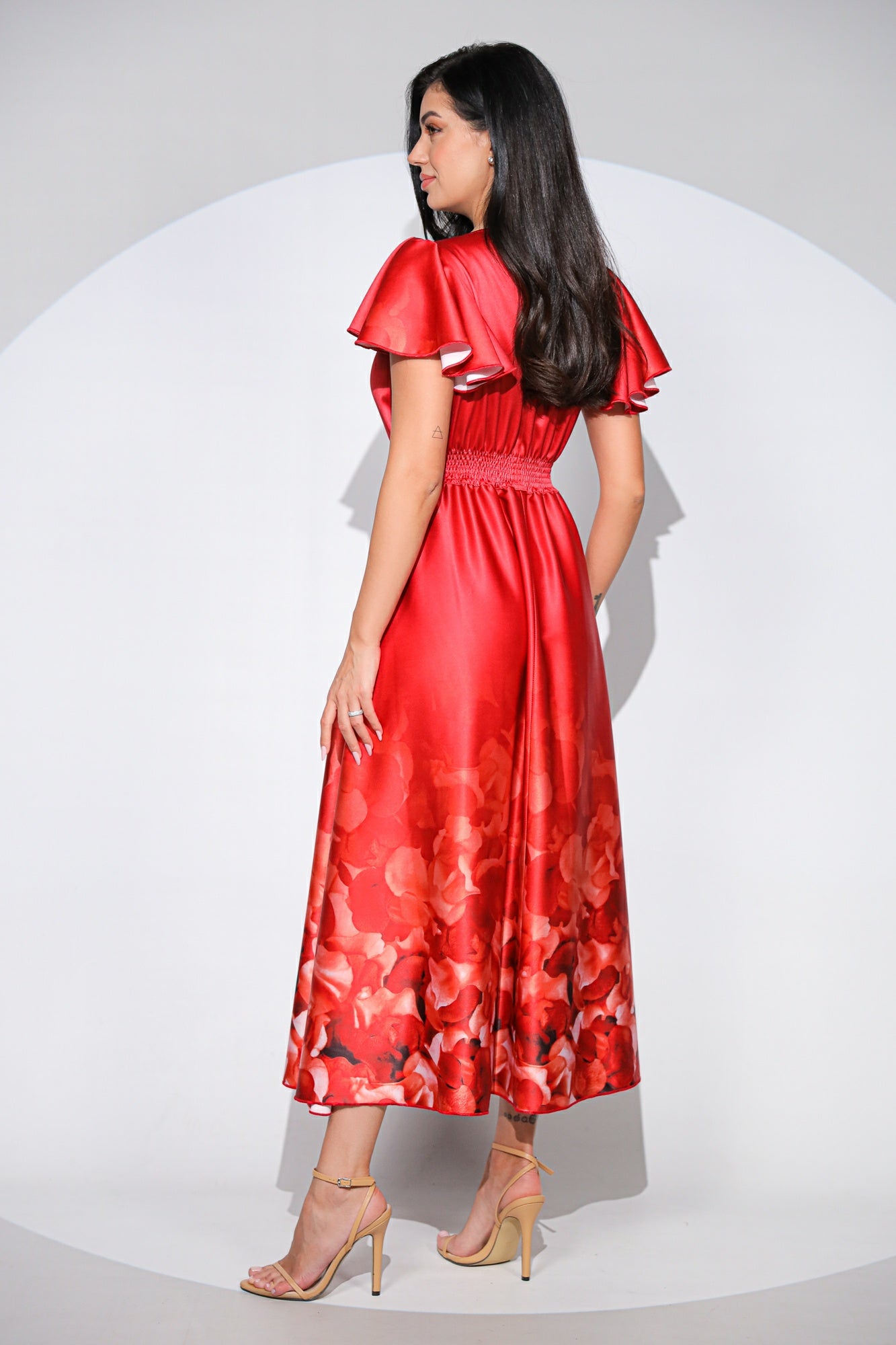 Rochia Scarlet din tafta fină cu reflexe satinate, croi petrecut și imprimeu floral degrade